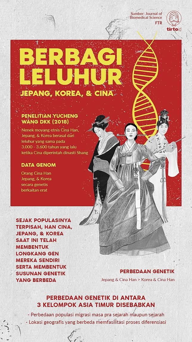 Tampaknya baik orang Korea maupun Jepang harus menerima jika dalam tubuh mereka mengalir darah orang Asia Timur lainnya yang lebih tua, yaitu etnis Cina Han.Penelitian Yuchen Wang dkk berjudul “Genetic structure, divergence and admixture of Han Chinese, Japanese and Korean populations” (2018) menunjukkan bahwa orang Cina Han, Korea dan Jepang pernah berbagi leluhur yang sama di daratan Cina sekitar 3.000 sampai 3.600 tahun yang lalu pada masa dinasti Shang. Han sendiri adalah kelompok etnis mayoritas di Cina yang esksis seiring dengan berdirinya dinasti Han pada 206 SM sampai 220 M.